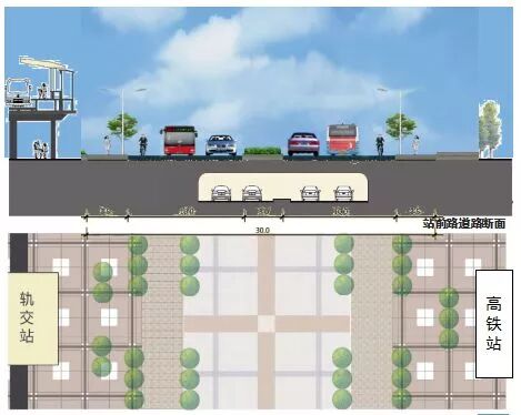非下穿路段,建议按双向四车道,机非分行(四块板)规划,能最大限度疏通人流车流,快速通达高铁站外围区域,并保障交通安全。