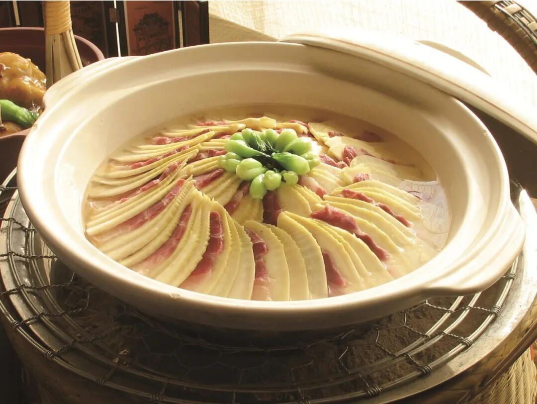 以切成薄如纸的歙县问政山笋铺底,中心点缀朵朵黛玉般的香菇、笋片镶嵌腊肉片而成。