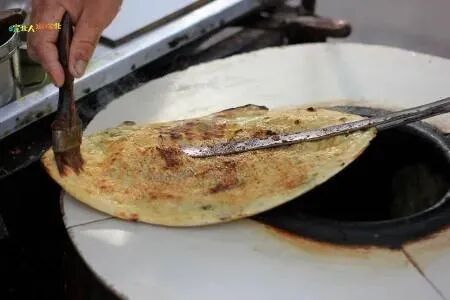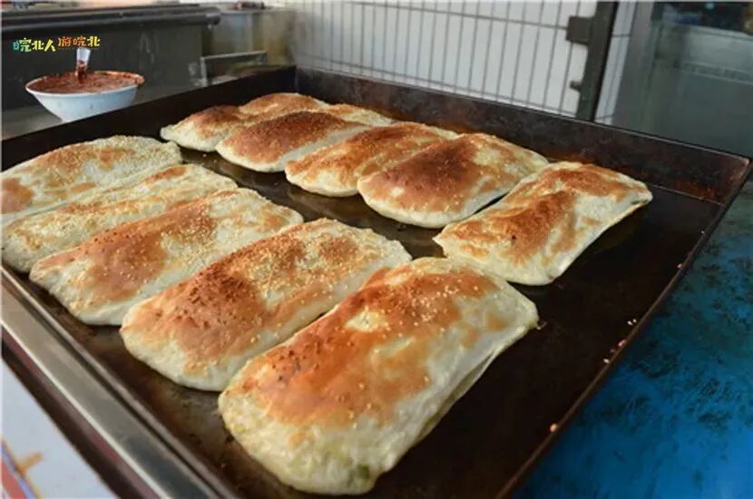 还有一种类似外地的锅盔,是放在类似老式烤红薯的炭炉里烤的,老板拿个铁钩子,一钩一个刚出锅,外焦里嫩,口感筋道,葱香四溢。