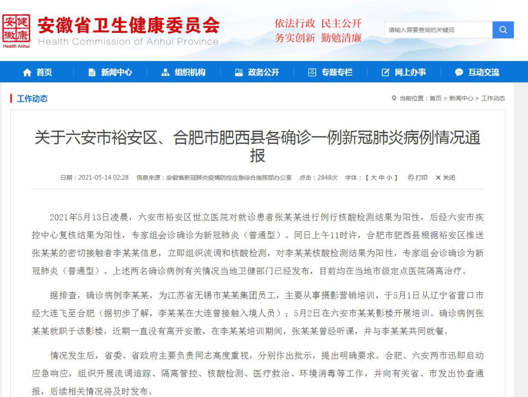 关于六安市裕安区、合肥市肥西县各确诊一例新冠肺炎病例情况通报