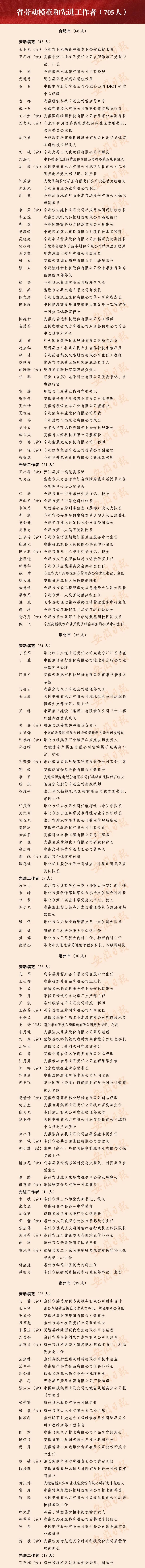 今年是五年一次的省劳动模范、先进工作者和先进集体评选表彰年,经基层推荐、集中审核、征求意见、省级公示等程序后,我省表彰705名省劳动模范和先进工作者(490名省劳动模范、215名省先进工作者),98个省先进集体。