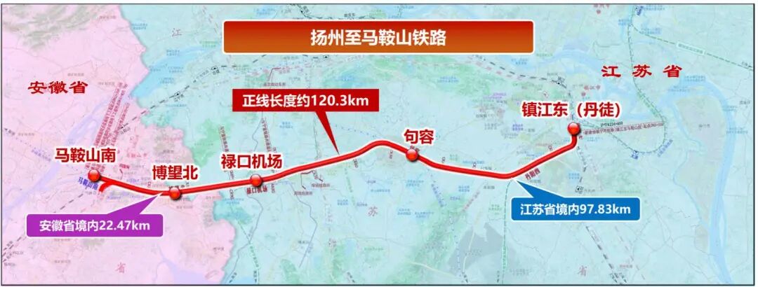 扬州至马鞍山铁路位于江苏省和安徽省境内,为东西走向铁路,线路东端起自沪宁城际铁路丹徒站,向西经镇江、南京市,终至在建巢马城际铁路马鞍山南站,正线长约120.3公里。
