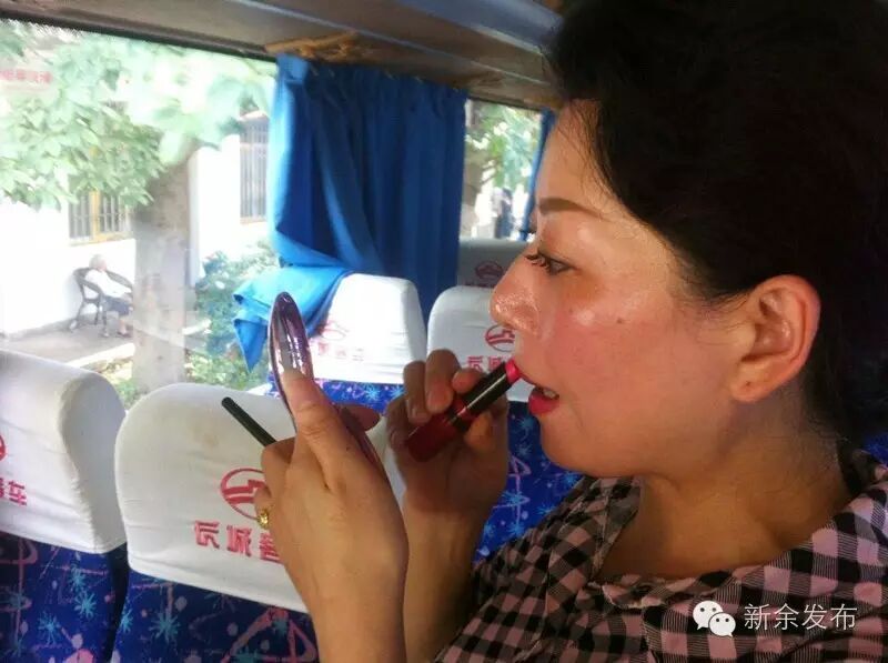 刘红艳在大巴车上化妆。