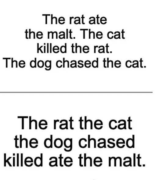 如果把后两句都揉进第一句,就会变成:狗追赶的那只猫杀死的老鼠吃了麦芽。