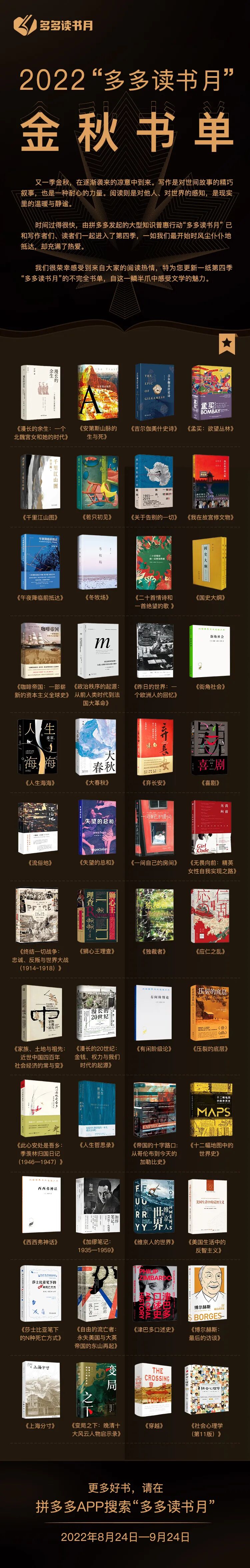 6000字的论文致谢,是一粒种子长成大树的故事,也是无数贫寒学子靠知识改变命运的缩影。苏正民的故事,给了“读书无用论”“寒门再难出贵子”这样的消极论调有力一击。当被命运分配了一个比所有人都要低的起点,我们却仍旧有希望,通过读书将有限的筹码发挥到极致。拼多多想以微薄之力帮助更多偏远山区的孩子读到经典书籍,2021年4月,“为你读书”公益捐赠行动从四川省凉山彝族自治州启动。在一年多的时间里,拼多多持续走进中国偏远的高原、山区、乡村……为中小学校的孩子们捐赠图书,并邀请国内知名作家、学者,和孩子们一起读书,截至2022年7月,累计捐赠图书达25万册。同时,拼多多提出知识普惠的长期理念,并发起大型正版图书补贴计划“多多读书月”,和帮扶优质创作者的“众声创作者计划”。拼多多希望能够以此鼓励孩子们“多多读书”,因为读书“总有答案”。如今,“多多读书月”已伴随读者们行进了4季,累计数千万人次在这里“拼”知识,购买正版经典好书,享受愉快难忘的阅读体验。8月24日,“多多读书月”再次启航,仍然秉持“平价好书,全民悦读”的理念,对优质、经典图书进行源头直补,致力于给热爱阅读的读者们带来更多平价正版好书,也希望将更多的知识传递给广大的读者。今天,我们从百亿补贴加持读书基金官方补贴的超600万册正版经典图书中,特别为大家挑选出了6本,涵盖多个类别,诚邀您共赴一场阅读盛宴。“我在外省各处游荡,与月亮和星星相伴,一次次被旧时的云彩所追赶,迷失在绵绵无尽的梦境之中。”——程永新程永新的文字,总让人有一种亲切感,那是属于一个时代的文字。这本书收录了5篇题材与风格各异的小说,有融合了历史和武侠的类型小说,有充满悬念的双线故事,有青春岁月的情感流露,有充满感伤的时代追寻……对于这本小说集,余华说:“程永新既写下了我们,也写下了他们,同时让我们和他们在书中熠熠闪光。”苏童看了后说:“八十年代就造好的船,现在启航了。我们看见那船急速地穿越暗黑的洋面,也穿越了时光,留下一路银色的水花。我们听见某种海浪般的声音,那个声音时而澎湃,时而宁静,说的是时间的故事,也是探险的故事。”“《风声》中有大孤独,也有大绝望、大坚韧,恰如我当时的心境。看似我写了一群无情之人,而这恰恰是我最深情的作品。”——麦家作为麦家代表作之一,《风声》具有奇异的想象力和独创性,人物内心幽暗神秘,故事传奇曲折,充满灵魂不可思议的力量。曾获《人民文学》杂志优秀长篇小说奖,根据小说改编的电影《风声》,更是掀起了中国当代谍战影视的狂潮,影响巨大。1941年的中国,“二战”局势未明,日本人为了揪出系统内部的特务“老鬼”,将5个嫌疑人囚禁起来。在绝境中,人人在找鬼,搞鬼,暗算,栽赃,厮杀……而真正的老鬼,只能在孤立无援中,忍辱负重,绝地反击。这是一个人面对困局,对抗孤独和绝望,跳出命运深渊的故事。“世间多难,人生多险,我们注定孤独,我们也注定坚韧。”“如果你只想读我的一本书,让我推荐一本代表作,我就推荐这本书。”——周国平《人生哲思录》是一本适合静静阅读的枕边书,一本可随时放在案头、手边的人生辞典。122个人生关键词,122个人生答案。生死、苦乐、两性、爱、美、孤独、艺术、人性、世态、读书、写作……人生方方面面,大事小事,周国平都以哲学之心一一解答。人生中有种种不如意处,哲学提供了一种视角,帮助我们坦然面对和接受。它不只是慰藉,更是智慧。不论你当下心境如何,都试着翻开此书吧,人生,总要读读周国平。“想到那种温文、和蔼、威仪,那都是优裕、独处、空闲的产物。”——伍尔夫