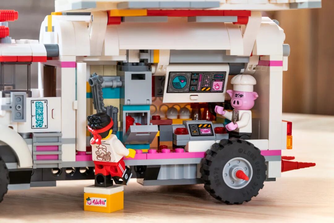 巨大的齐天大圣黄金机甲走的是写意京剧舞台风,细腰乍背的红色机体上搭配了雉鸡翎头冠、靠旗和山纹裙甲,再用一道道乐高玩具中也少见金色元素做滚边,让威风凛凛的齐天大圣获得了一个前所未见的崭新状态。