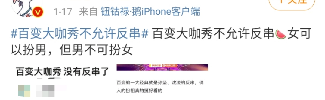 另一方面,也得考虑名誉侵权、侵犯版权这些实际问题。此前孙坚在百变大咖秀的舞台上模仿阿雅,结束后何炅谢娜还会走上台来疯狂打圆场“阿雅是我们的好朋友”。播出前就有网传流言,称这一季可能不允许反串,可节目史上不少经典节目就是反串。