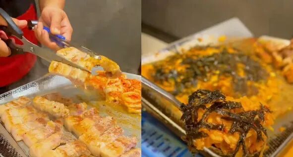 最后剩下的肉跟米饭放在一起,加辣酱炒成炒饭,再撒上一把海苔。