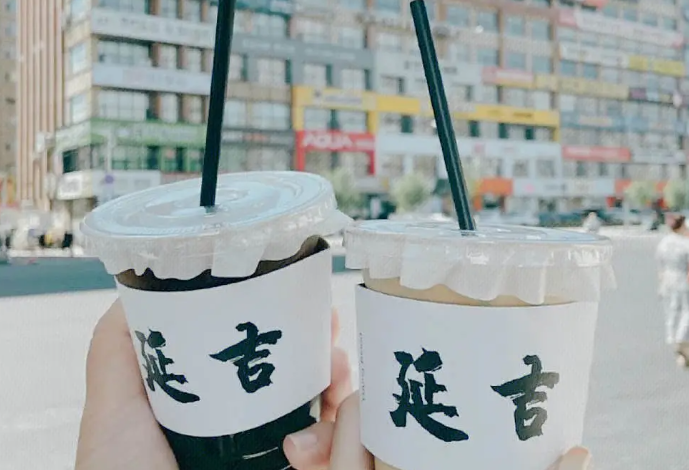 拍照者举着写有“延吉”字样的咖啡,背景是一栋挂满招牌的大楼。
