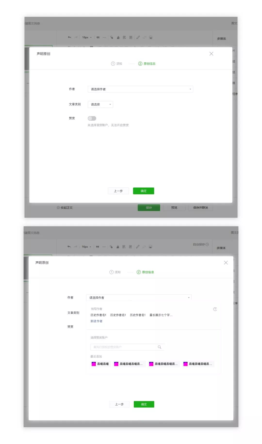 5. 订阅号助手App编辑文章时是否能选择赞赏账户?