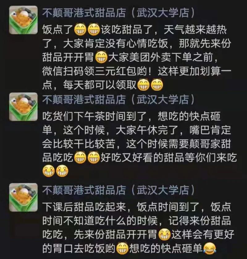 在产品推广的口碑嬗变过程中,对某种食品感观的异变具有不可趋避性,此时,推广主体对于接收受众信息反馈的敏锐度与及时回应的时效性就显得极其重要。这要求销售主体拥有极高的用户信息视野广度——朋友圈客户数量与对受众心理的准确把握即共情能力。实验表明,在微信红包弹窗出现时,下意识点击的概率趋近于100% 。虽然实验数据从何而来我们不得而知,但从人性的角度出发,并不难理解。毕竟现代人是看着地上躺的一元钱不屑于弯腰,但会为不知名数目红包疯狂敲击屏幕,抢到几毛钱会兴奋不已的神奇生物。而咖啡店IN CAFE敏锐的把握住这一点,以红包为抓手,运气王折扣为手段,不仅限缩折扣群体范围削减成本,而且营造出一种得折扣折者欧气爆棚的幸运优越感,这种红包+欧气奖励的双重buff,又狡猾的加上“当天”的时限,让珞珞直呼内行。咳咳,研究小组严谨而细致的研究后,我们可以得出这样的结论了——他们真的真的,很努力。或许只是短短的几十个字的文案,他们会反复斟酌,也会在表情包的海洋里挑选,一如坐在考场上对着选择题咬着笔头,犹豫不定的你。或许我们眼中他们精心设计的广告有时刻意得那么可爱又好笑。但仔细想想,努力营业的背后,是积极生活的一种姿态,一种质朴简单的努力。或许,我们在快乐干饭时,也能在这个偷偷发光的群体身上,学到点什么...btw,凌波门今天开了,或许校外的老板们也要参与到这场营业的内卷中了(不是)!【1】掌上武大,《专业团队:我们尝试了四种方法当面对线石楠》【3】3号厅检票员工——《利路修下班了,我们呢?》【11】武大经管外联 荷包守护计划|#10 名杨米粉——美食家的挑剔,艺术家的野心特别鸣谢掌武的吃货编辑们和pyq的资深干饭人们![]()