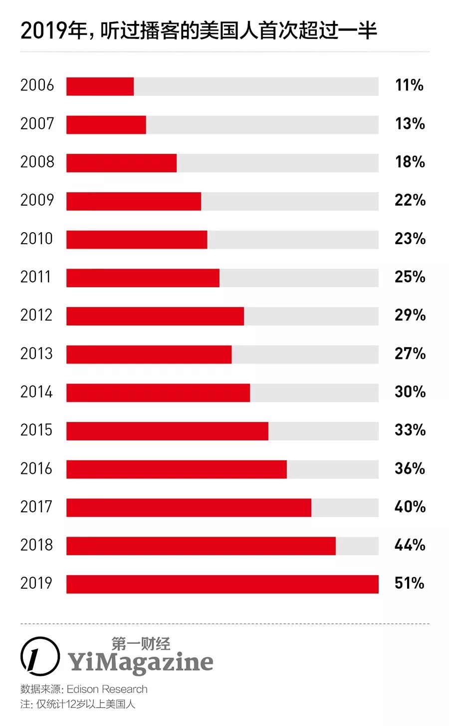 在《Serial》之后,美国出现了越来越多制作精良的播客节目,制作者大都有传统广播电台的从业经历。咨询机构Edison Research预计,听过播客的美国人(12岁以上)将在2019年首次超过50%,比2018年多出2000万人,播客正在成为美国用户增长最快的媒体形式。另一个行业大事件是,2019年2月,流媒体平台Spotify花2亿美元买下了播客制作公司Gimlet,后者同样由一群公共电台出身的制作人创立,旗下运营了几档美国最受欢迎的播客节目。与此同时,广告主们也盯上了这个新形式,几乎每一个热门播客都出现了口播广告。