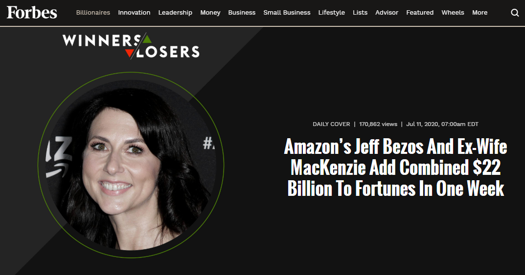 当时,麦肯齐以360亿美元财富位列《2020福布斯全球亿万富豪榜》第22位,也是世界上排名第4富有的女性。