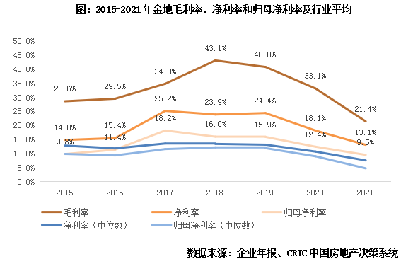 归母净利率目前维持10%左右,净利率和归母净利率都高于行业中位数。从利润率方面来看,由于整体市场环境走低,从2019年开始地的毛利率,净利率和归母净利率进入了下行阶段,其中毛利率从2018年的43.1%下降至2021年的21.4%,归母净利率从2018年的16%下降至9.5%。虽然金地集团近些年的毛利率、净利率和归母净利率都有所下降,但是无论是净利率还是归母净利率,都高于行业中位数,总体维持在中上水平,说明企业盈利水平较为稳定。