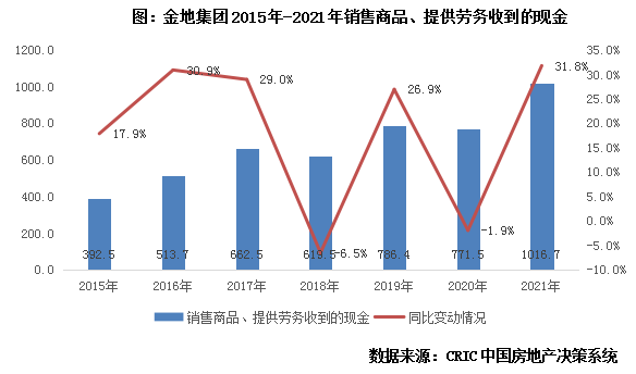 在现金流入方面,金地集团销售商品、提供劳务收现总额虽然在2018年和2020年呈现同比的下降,但整体上来看,仍然保持着随规模扩张稳步增长的趋势,尤其值得关注的是,2021年企业销售商品、提供劳务收现总额同比增31.8%,首次突破1000亿。
