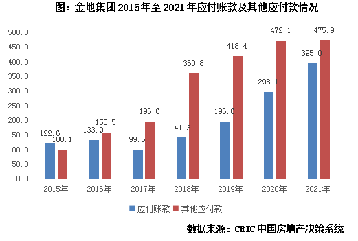 隐性负债方面,金地集团的应付类款项规模呈现与销售规模正相关的良性增长,且近三年以来其他应付款规模已经得到控制。我们重点关注企业的应付账款(主要是应付工程款及土地价款)及其他应付款(主要是关联方往来款及预提土增税)两项。可以发现,企业应付账款和其他应付款项总额几乎均呈现随企业销售规模逐步增长的线性趋势,并且近三年内其他应付款总额增长十分有限,呈现稳定趋势。而尽管应付账款仍呈现线性增长,但我们关注到其自2017年至2021年平均年复合增长率约为31.3%,对照该期间企业21.4%的营收复合增长率来看,这种随规模增长而逐步增多的应付账款显然是良性的。