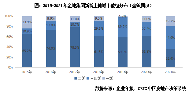 从投资区域分布上看,金地围绕三大城市圈形成“东密西强”的投资布局,其中金地集团在珠三角和长三角两个区域内投资力逐渐增加,环渤海和中西部的布局上更多选择省会城市,比如武汉、长沙等。整体来看,2015-2017年金地在环渤海和长三角地区的投资比重相对较高,从2018年开始,逐渐加大对珠三角和长三角地区的投资,长三角投资占比达到38%,珠三角地区的投资力度也从8%提升至15%,截止2021年底,金地在长三角、珠三角的投资占比超七成,一方面由于长三角、珠三角市场更加活跃,因此该地区三四线城市的市场潜力更易被挖掘,另一方面,金地在珠三角地区布局仍有空间,金地集团的资源逐渐向该地区倾斜。与此同时,金地在环渤海和中西部地区内的投资以区域内的高能级城市为主,2015-2021年金地在环渤海和中西部区域内一二线城市投资占比为93%,主要布局西部强市。