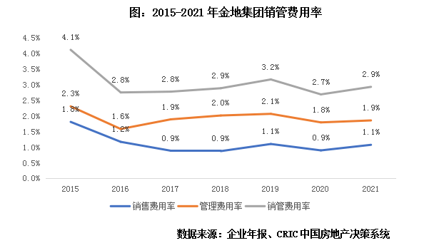 从2016年开始,金地集团的销管费用率始终维持在3%左右。从2016年金地集团销管费用率下降后,其销管费用率一直保持在相对平稳的水平,分开来看,管理费用率基本上维持在2%左右,销售费用率基本上维持在1%左右,总体销管费用率在3%左右。在管理红利时代,销管费用率是衡量企业管理能力的核心指标,说明其成本管理运营水平具有优势,处于行业前列。