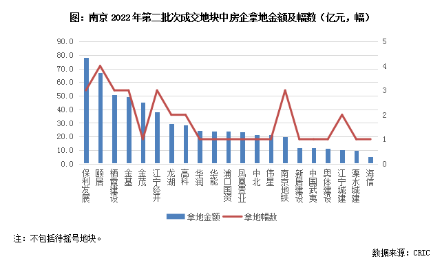 在推地量大幅增加下,尤其热点板块建邺河西、玄武孝陵卫、大校场、燕子矶等均有优质地块推出的影响,房企参拍积极性较首轮有所提升。不过,据市场流传参拍名单来看,资金实力雄厚的央国企仍是参拍主力,招商、华润、保利、中海、建发等多家房企的参拍地块数量都在5幅以上。