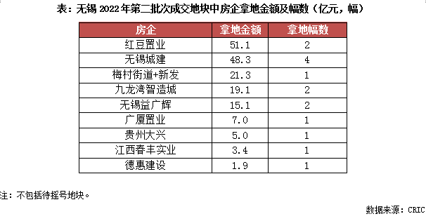 无锡次轮土拍热度的回温还体现在企业拿地方面。对比首轮集中土拍来看,无锡次轮成交地块中民企拿地比例明显提升,共有5幅地由民企拿下,其中本土企业红豆置业表现亮眼,以51亿元的总价夺得开发区乡镇博物馆东侧地块及锡东新城东翔路与规划道路交叉口西北侧地块2幅地块,是本轮土拍中拿地金额最高的房企。