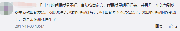 网友:几十年的睡眠质量不好,自从按肓俞穴,睡眠质量明显好转,并且几十年的每到秋冬季节就面部发烧,双脚冰凉的现象也明显好转,现在面部基本不怎么烧了,双脚也明显的感到热乎,真是太谢谢张医生了!