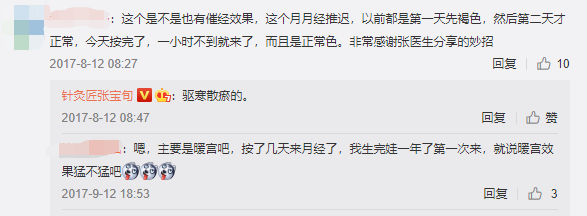 网友:嗯,主要是暖宫吧,按了几天来月经了,我生完娃一年了第一次来,就说暖宫效果猛不猛吧