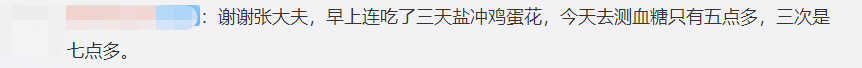 网友:谢谢张大夫,早上连吃了三天盐水冲鸡蛋花,今天去测血糖只有五点多,上次是七点多。