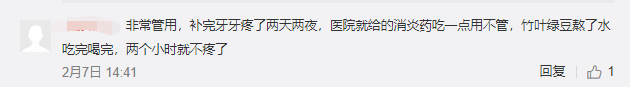 网友:非常管用,补完牙牙疼了两天两夜,医院就给的消炎药吃一点用不管,竹叶绿豆熬了水吃完喝完,两个小时就不疼了。