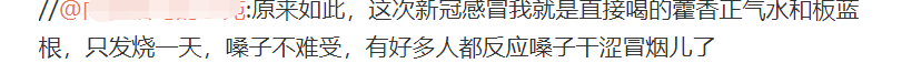 网友:原来如此,这次新冠感冒我就是直接喝的藿香正气水和板蓝根,只发烧一天,嗓子不难受,有好多人都反应嗓子干涩冒烟儿了。