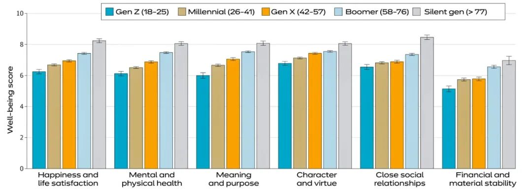 范德维勒:我们从2020年1月开始看到这一点,就在大流行之前。但2022年1月是第一次绝对明确:在我们观察的幸福的每个维度上——幸福、健康、意义、性格、人际关系、财务稳定性——每一个都严格地随着年龄增长。18到25岁的人觉得他们在所有这些方面都更差。这非常惊人,非常令人不安。