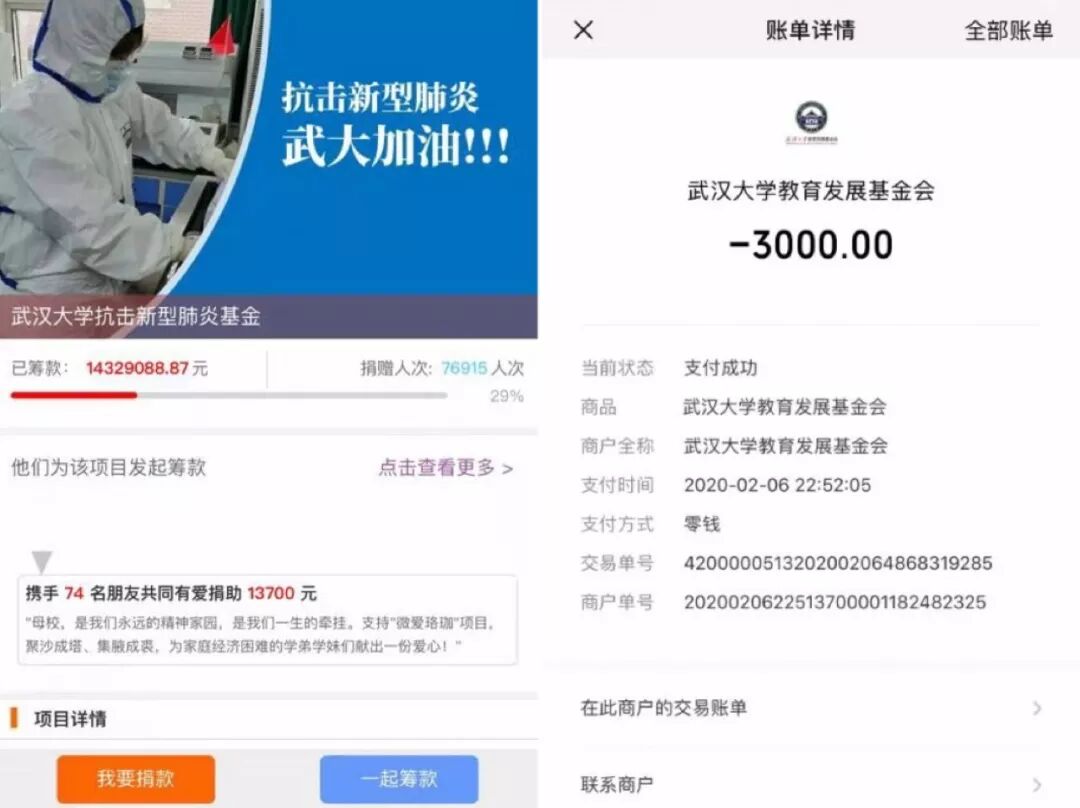 近期,海螺的两篇原创推文,截至目前为止,总共收到打赏 5498.2元。其中第一笔《大学生“战疫”指南》收到的2539.20元,已捐给公号“古典古少侠”,因为他们宣称国际采购,“把一流物资送给一线医护人员”,捐款额为2688元;第二笔《一个武汉市民的生活日记》收到的2959元,已捐给武汉大学教育发展基金会“武汉大学抗击新型肺炎基金”,捐款额为3000元。海螺主编个人捐款2000元,已捐给暨南大学附属第一医院孟医生,用于购买n95口罩给协和设备科和黄冈一线医护人员。以下为截图证明。