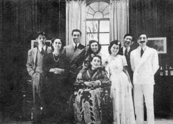 燕京剧社话剧《生死恋》演员合影:左二为张玉范,左三为卓富来,右一为程述尧,中坐者为孙道临,两人之间穿白裙的是麦任曾。