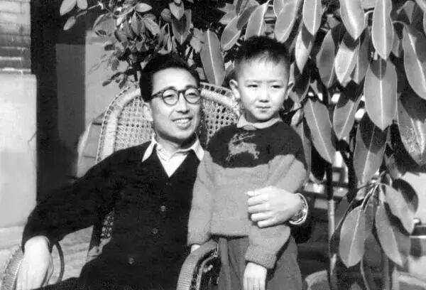父子两人在北京家中橡皮树前,1956年。