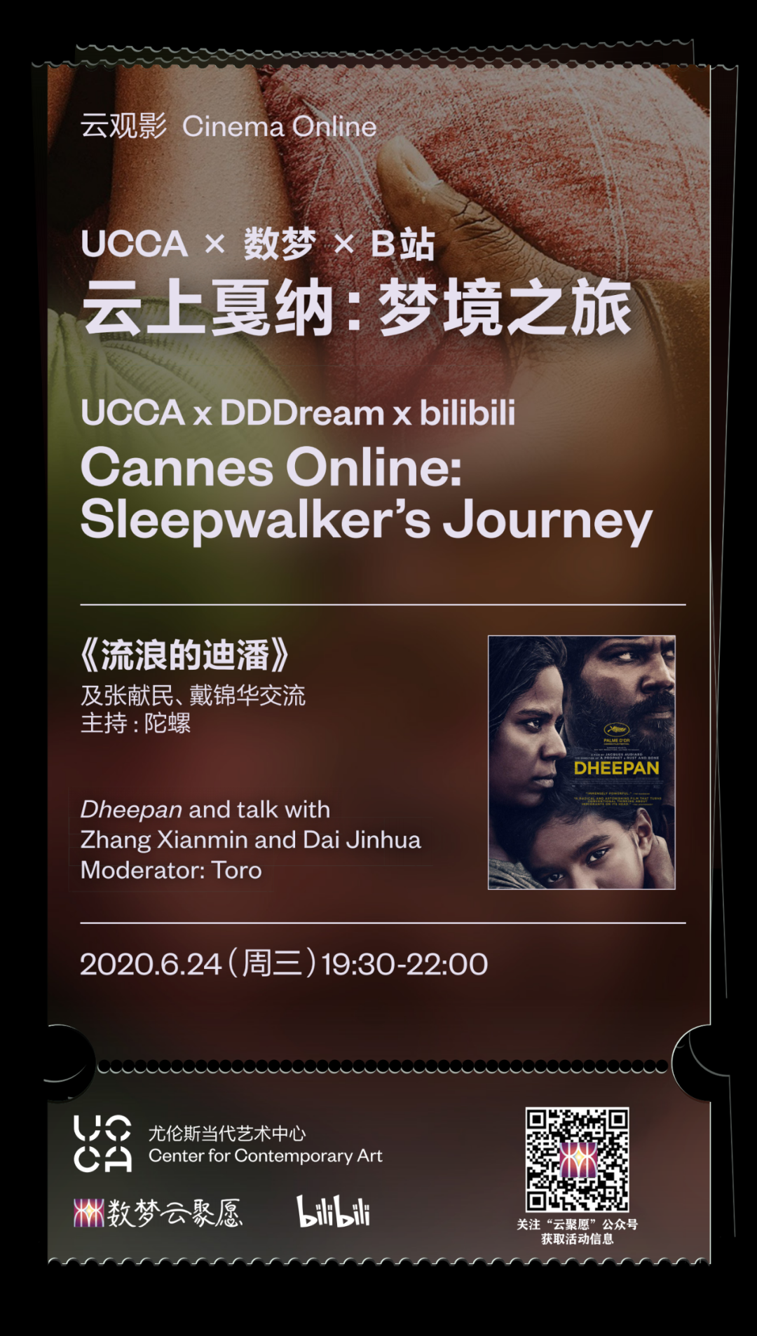 2020年6月24日至6月28日,数梦云聚愿DDDream携手UCCA和B站,共同策划推出以“云上戛纳:梦境之旅”为主题的云观影活动,通过“云端”展映5部来自过往戛纳电影节4个单元的获奖及入围影片,以云观影的方式得以在例外状态下回顾戛纳电影节的光影纷呈。
