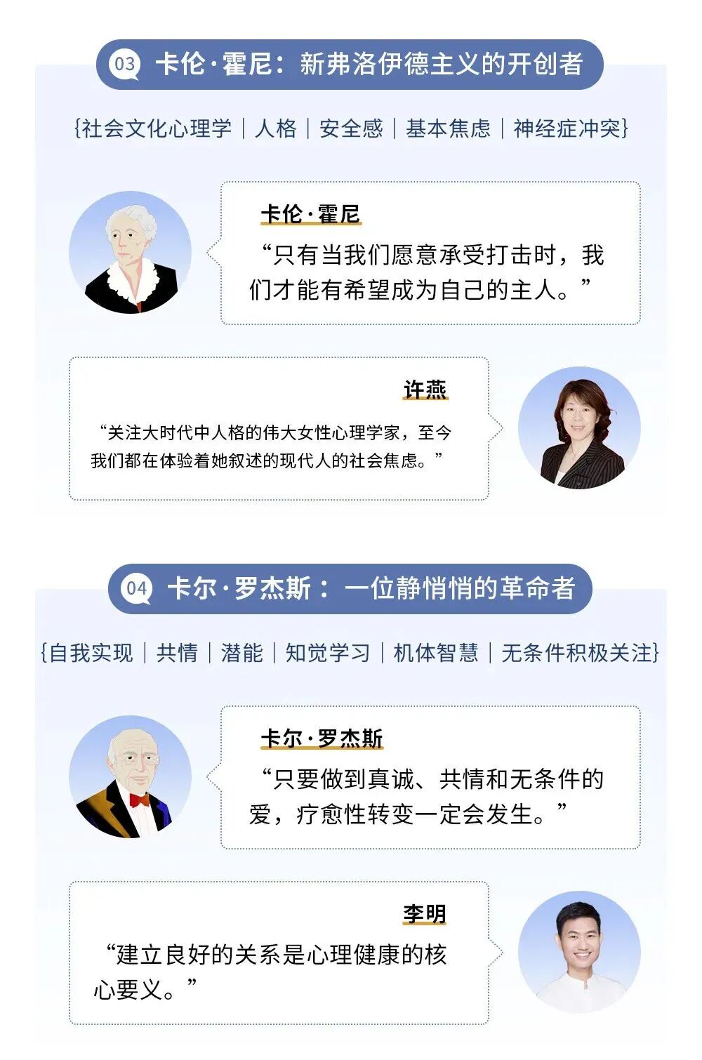 他们分别是西格蒙德·弗洛伊德、海因茨·科胡特、卡伦·霍尼、卡尔·罗杰斯、戴维·麦克里兰、阿伦·贝克、萨尔瓦多·米纽钦、乔·卡巴金、肯尼斯·J·格根、斯蒂文·海耶斯。