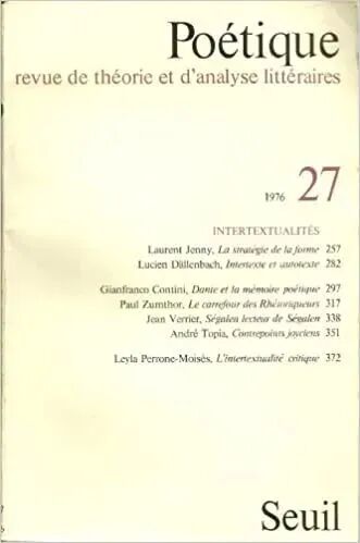 从诗学和修辞学角度界定互文性概念的最早迹象大约出现于1976年。这一年,热奈特和托多罗夫主编的《诗学》杂志第27期推出了“互文性研究”专号,其中刊登的两篇重要论文明显表现出希望摆脱“如是”小组的意识形态语境的倾向。两篇论文的作者接受了互文性这个术语,但没有接受先锋派对它的阐释。他们重新定义了这一概念,力图使它更清晰,更具有操作性,这就是我们所说的建构的互文性理论的开端。从这期专号开始,把互文性写作当作文学手法来研究的论文选题逐渐增多,大学文学专业的新编教科书也开始把互文性作为一个分析工具来讲解。最早在教科书中引入互文性概念的大约是曼戈诺的《话语分析方法入门》(1976),此书虽然提到了克里斯特瓦的互文性概念,但立刻说明不在她的意义上使用这个词,只把“互文本”定义为“一个文本的内部所表现出的与其他文本的关系的总和(引文、戏拟、转述、否定等等)”[13] 。这个定义基本上反映了后来各种普通词典的释义。沿着这个思路,从七十年代后期开始,法国学者逐渐把重点放在对文本间各种关系的界定、识别、分类和分析上来。这个时期的法语学术刊物专号还有1978年的《美学杂志》第3-4期、1980年的《思想》第215期、1981年的《文学》第41期、1983年的《文本》第2期等,正是这些研究成果显示了互文性作为一种可操作的文学研究方法的发展前景。