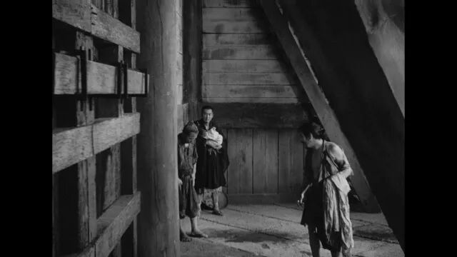 接着是第二重叙事空间。第一重叙事空间是以罗生门为主舞台,三个人在这里讨论这个案件,第二重重要的造型空间也是重要的舞台,就是公堂,公堂供述或者审案过程。这个段落采取了一个极端奇特的、带有鲜明的艺术电影或者先锋电影特征的摄影机机位及其造型空间的设置,它和我们能想象的任何公堂之上都不一样,它是一个几乎荒芜的空旷的空间,在这个空间当中,光影形成了黑白画面当中极端清晰的极端匀称的反差非常鲜明的水平线条的切割,使整个画面具有一种奇特的空旷的装饰感,而所有的当事人、罪犯、证人、报案者、目击者,都是在水平机位当中直面着摄影机方向展开他们的供述,画面的景别基本上采取的是中景、近景及特写,画框紧紧地把人物框在其中,人物的头和脸顶到画框上缘,甚至冲破画框上缘。