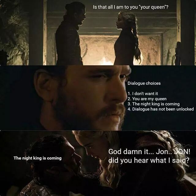 为了完成这一滥套式的反转,编剧不惜献祭更多的主角OOC:于是我们看到,曾在公开审判中愤怒诅咒君临庸众的小恶魔,竟直接化作慈悲为怀的活菩萨,站在人道主义的道德高地,彻底否决龙母执-政的-合-法-性;我们还看到,由光明磊落的奈德·史塔克抚养教育的琼恩·雪诺,不但在转瞬之间就将奈德以名誉为代价保守一生的秘密泄露开去,而且还用匕首暗杀这样的手段,在接吻示爱的过程中,将已被编剧安上“恋爱脑”的龙母突然刺死。