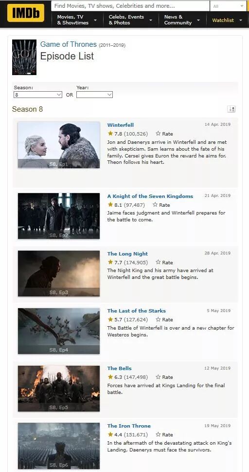 一个月前,当《权力的游戏》最终季正式开播时,恐怕很少有人能料想到,这个曾让无数观众翘首企盼的大众文化产品,竟会如此令人不堪忍受,这部创造了艾美奖获奖纪录与美剧收视率纪录的“史诗级神剧”,竟会迎来“史诗级的烂尾”。