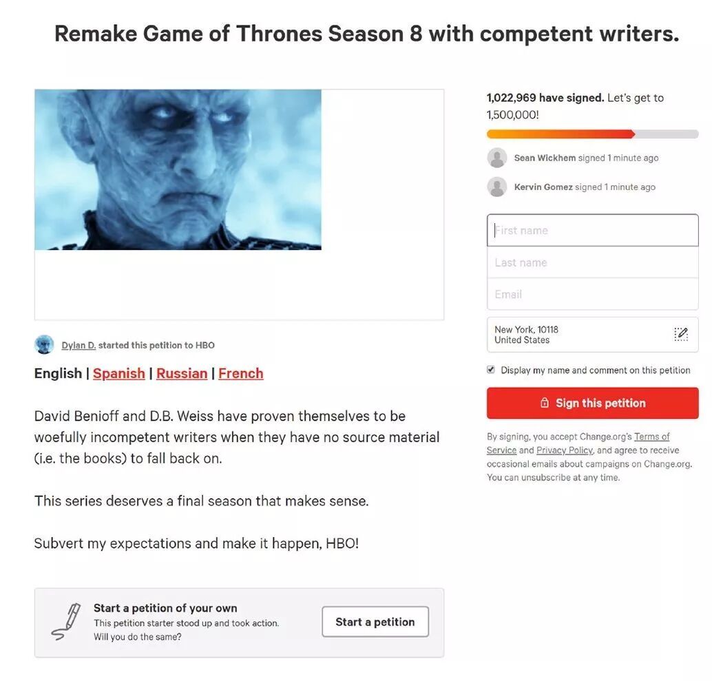 绝大多数深感不满的观众,都将抨击的矛头直指这部剧的两位编剧——不幸的是,他俩还是大权在握而又刚愎自用的执行制片人。一份支持量超过100万的在线请愿书,写出了很多剧迷的心声: