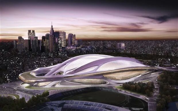 “新国立竞技场”2012年成功投标的设计图。最初建设成本为10.5亿美元,其后估算成本攀升至20亿美元。2015年被撤,重新招标。