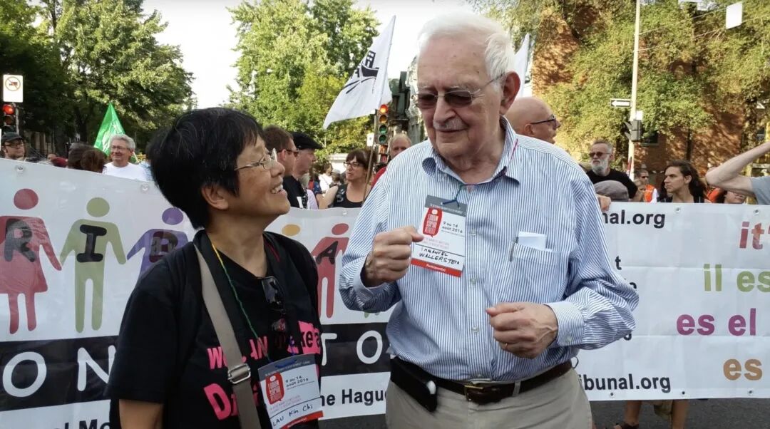 2016年8月蒙特利尔世界社会论坛开幕游行。沃勒斯坦与刘健芝。