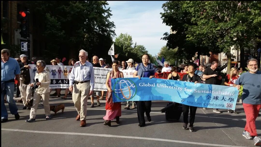 2016年8月蒙特利尔世界社会论坛开幕游行,刘健芝(右二)、戴锦华(右三)、沃勒斯坦(左三)、沃勒斯坦妻子Beatrice Wallerstein (左二)。