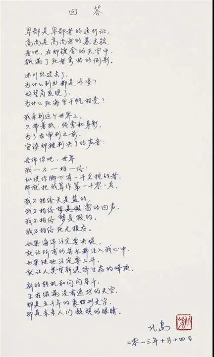 北岛《回答》手迹