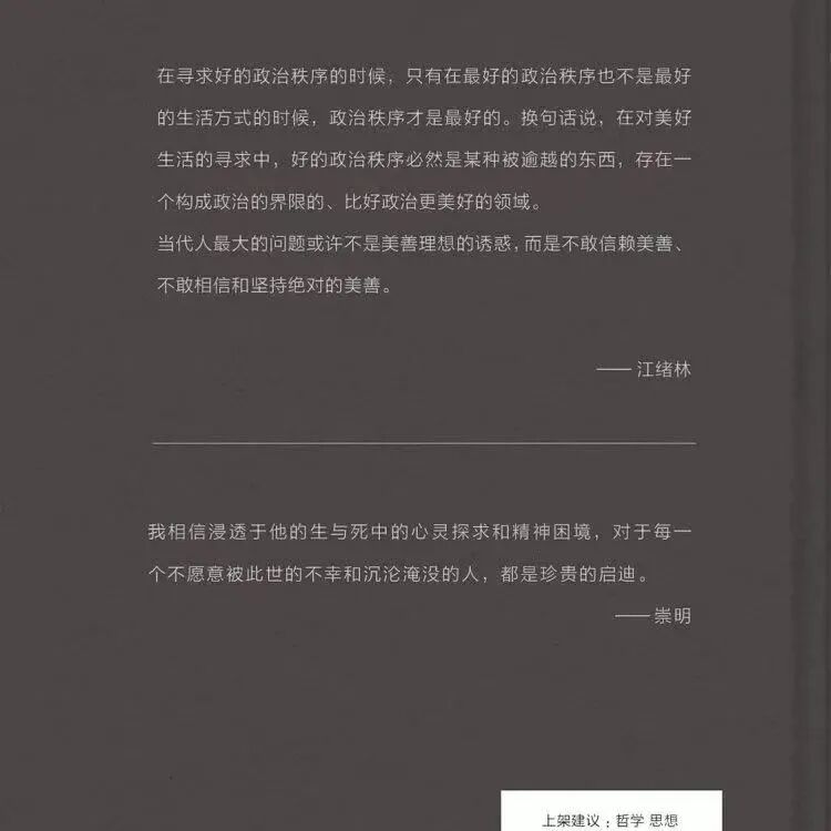 无论我们的处境如何脆弱,都有必要培养思想和生命的厚度,如此才能够豁达地委身于政治理解或事业而不至于为其所伤。只有从丰厚的思想和生命中汲取能量,才能豁达而充满希望地以人性之光透射历史和政治的幽暗之处。