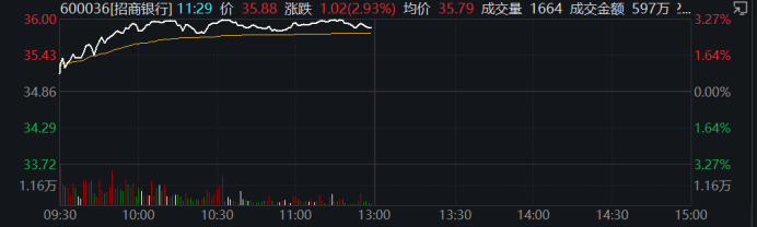 金融板块逆势上扬,其中银行板块盘中涨幅超过1%。银行龙头之一的招商银行A股盘中涨幅一度超过3%。