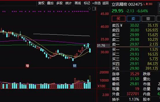 立讯精密今天上午股价也一改之前的强势,股价一度大跌逾7%。