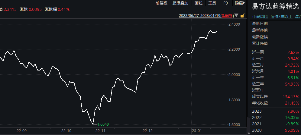 Wind显示,从去年11月到今年1月19日,张坤的易方达蓝筹基金暴涨达到46%,反弹幅度在主动偏股基金中居前。