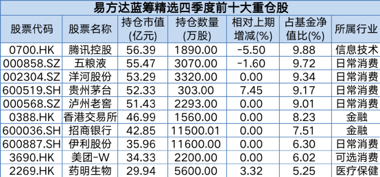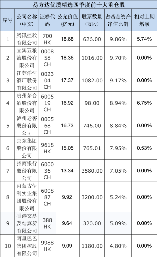 从易方达蓝筹精选四季度末持仓上看,前十大重仓股一股未变,腾讯控股晋升其第一大重仓股,五粮液、洋河股份成为其第二、第三大重仓股,而在去年三季度末,该基金前三大重仓股依次是泸州老窖、贵州茅台、五粮液。