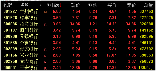 银行板块也有所拉升,兰州银行涨5.58%,瑞丰银行、招商银行、厦门银行、无锡银行、齐鲁银行等涨超3%;港股招商银行涨4.5%。